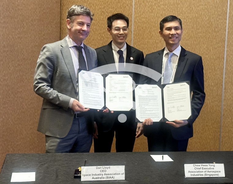 AAIS-SIAA MoU signing ceremony between Mr Chew Hwee Yong, Chief Executive Association of Aerospace Industries of Singapore, and Mr Dan Lloyd, CEO Space Industry Association of Australia. Witness : Mr Jonathan Hung, Executive Director Office for Space Technology & Industry, Singapore.