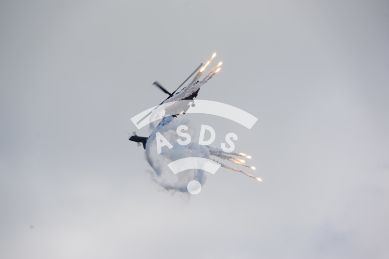 Singapore Airshow 2026 – Flying display of an RSAF AH-64D Apache attack helicopter flying, dispensing self-protection infrared flares.